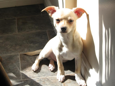 Gucci is housetraining beautifully .. really happy and doesn't bark except if she sees something unusual, and then it's a quick PFFT to her and she stops ... loves her carrier and sleeps as soon as the car starts .. not at all fidgety, very cuddly and loves her fleece blankets, sleeping bags which I made, toys and pink bed .. we taught her to sit and she caught on after three tries ... met a Dogue de Bordeaux at the mall and wasn't too sure about him ... oh, and she's also learned to text.